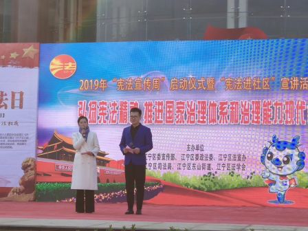 12月4日,2019年江宁区“宪法宣传周”启动仪式暨“宪法进社区”宣讲活动在东山休闲文化广场隆重举行。区委常委、政法委书记周玉刚,区司法局、区法学会、东山街道主要领导,以及区纪委监委、区法院、检察院、公安分局、全区“谁执法谁普法”重点单位的分管领导,以及周边社区居民群众等约600余人参加活动。
