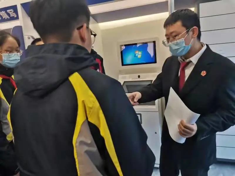 活动一开始,扮演原告及其代理人的同学来到法院自助立案机前,模拟立案操作。