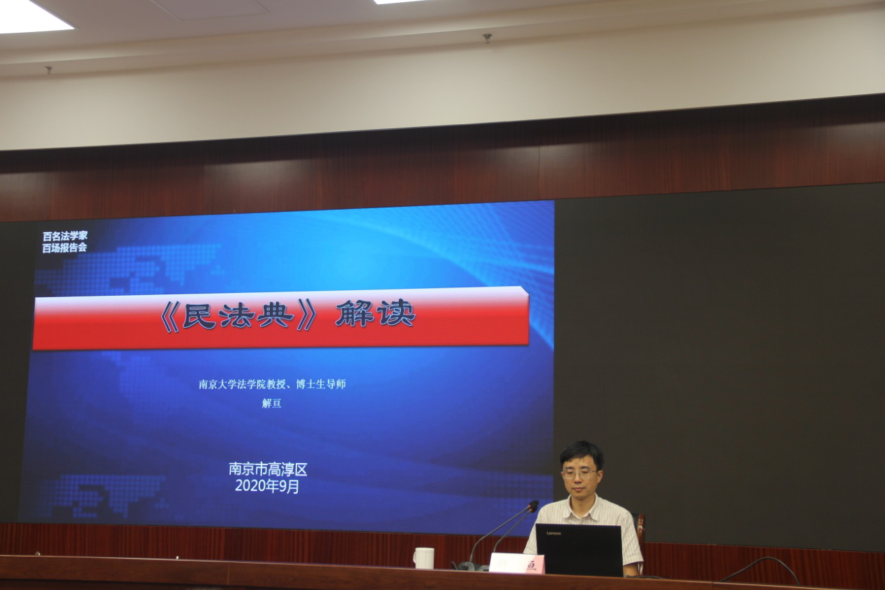 9月3日下午,由高淳区法学会组织的区委中心组学习报告会,邀请了南京大学教授、博士生导师解亘作《<民法典>解读》专题辅导报告,高淳区委常委、宣传部部长、统战部部长施冬咏主持,区委理论学习中心组全体成员、各部委办局、区直各单位主要负责人、巡察办、巡察组主要负责人在主会场参加了报告会。同时,通过视频会议系统,在各街镇、各部委办局等设立分会场,全区各街镇领导班子成员、中层干部、村(社区)“两委”班子主要负责人、各部委办局、区直各单位全体干部在各分会场集中收听收看。