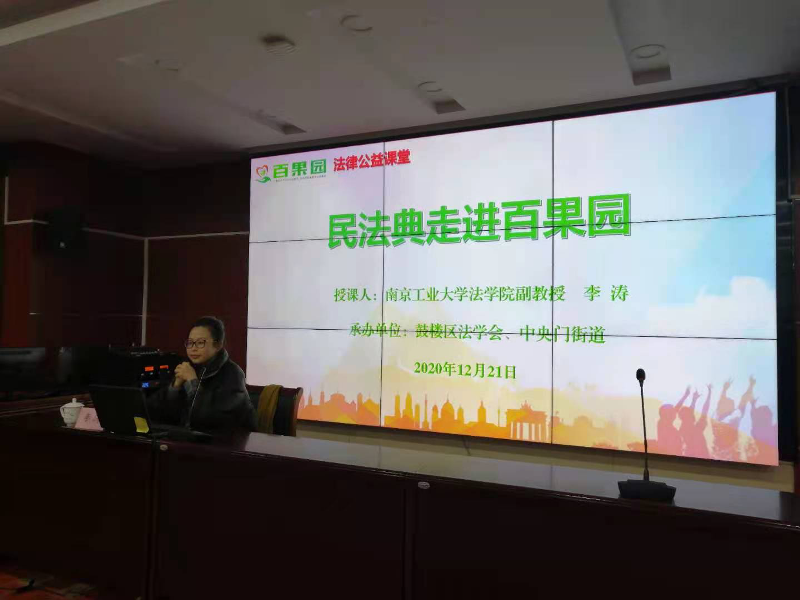 12月21日下午,鼓楼区法学会和中央门街道共同开展民法典走进“百果园”普法活动。邀请南京工业大学法学院副教授李涛为辖区党员、居民和两新党组织进行普法讲座,共有60多名社区党员群众参加。