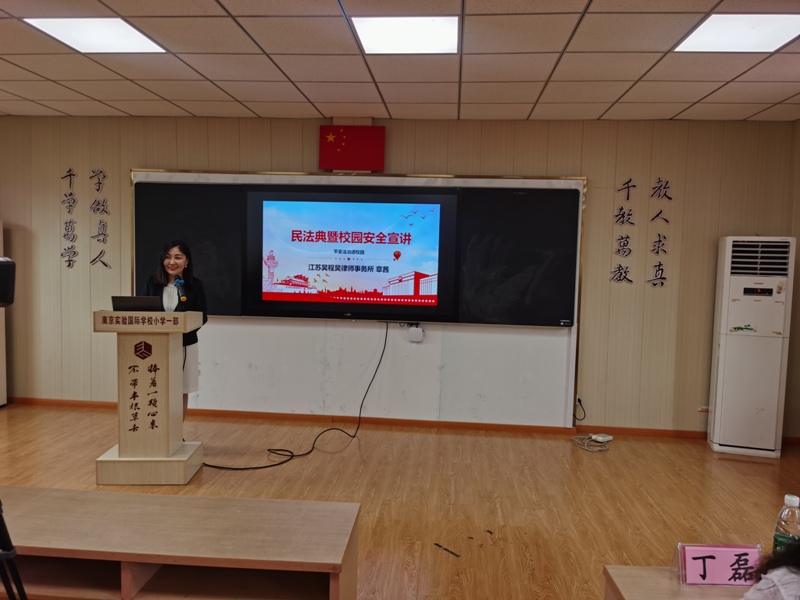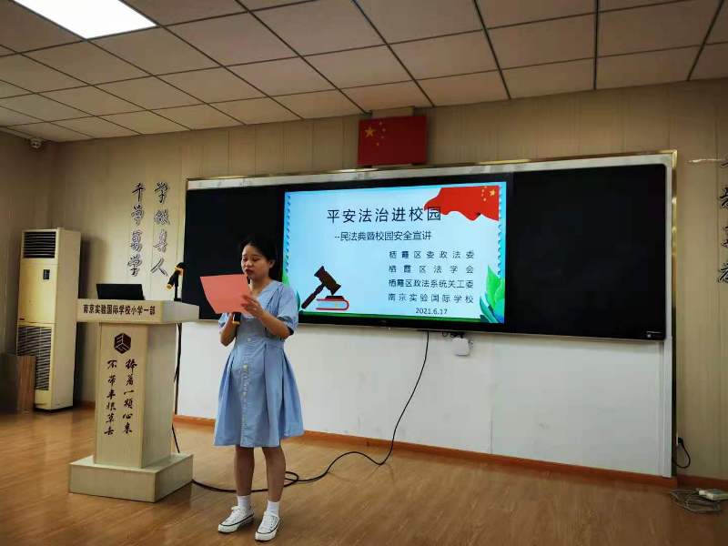 6月17日下午,栖霞区法学会联合区委政法委、区政法系统关工委,邀请南京市民法典宣讲团成员章茜律师在南京实验国际学校,面向全校四年级学生,送上了一堂生动的法治启蒙课。区委政法委副书记方万军、区法学会专职副会长丁磊、区政法系统关工委秘书长徐娟、南京实验国际学校小学部校长胡振及年级班主任,一起旁听了此次宣讲课。
