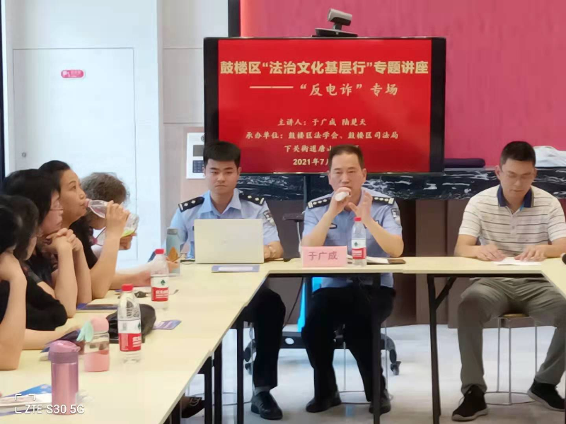 7月20日下午,鼓楼区“法治文化基层行”走进下关街道唐山路社区,邀请鼓楼公安分局刑警大队于广成大队长、陆楚天警官为社区居民开展“反电信诈骗”专题宣讲。鼓楼区法学会常务副会长谈国苹及唐山路社区居民50多人参加了专场活动。