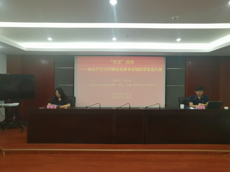 7月20日上午,高淳区法学会邀请中国证券法学研究会理事、国浩(上海)律师事务所资深顾问,原中国证监会上海专员办处长黄江东博士,做题为《两办<关于依法从严打击证券违法活动的意见>解读及未来资本市场形势前瞻》的专题讲座。区人大、纪委监委、政法各部门、各街镇、相关金融监管部门、律所、企业近40家单位共100余人聆听讲座。