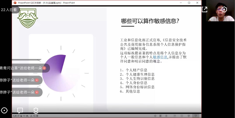 普法志愿者王景瑞化身“普法主播”,通过直播平台讲解了疫情防控期间关于个人信息保护的相关知识。并在直播过程中,针对评论区大家提出的法律问题进行解答,切实解决了居民所需,达到了普法的目的。