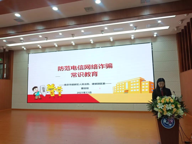 建邺区法学会会员、建邺法院法官助理曹琼琼重点围绕未成年人防范电信网络诈骗展开授课,列举了一些生活中典型的对未成年人电信网络诈骗的犯罪案例,并向师生们讲解了遇到诈骗的应对措施及被诈骗后的挽救措施,并现场为学生们播放了防范电信网络诈骗动画视频,加深同学们对宣讲内容的理解。