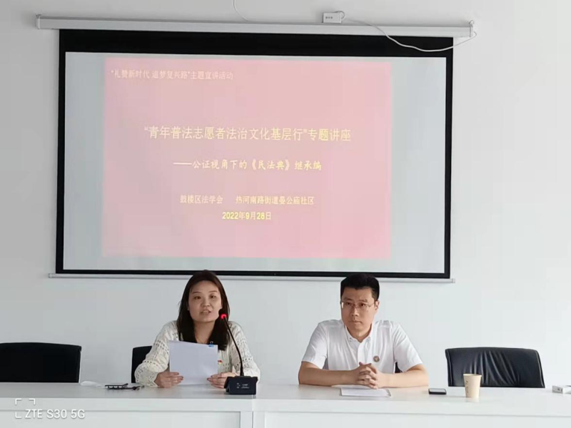 为认真落实习近平总书记“让民法典等走到群众身边、走进群众心里”的要求,为党的二十大胜利召开营造和谐稳定的社会环境,9月28日下午,鼓楼区法学会组织开展的“礼赞新时代 追梦复兴路”——“青年普法志愿者法治文化基层行”活动走进晏公庙社区。邀请江苏省公证协会理事、南京市公证协会奖励与惩罚委员会副主任委员、南京市鼓楼区习近平法治思想宣讲团成员、鼓楼公证处主任戴伟以“公证视角下的《民法典》——继承编”为题,开展《民法典》专题宣讲,辖区40余名居民聆听了讲座。