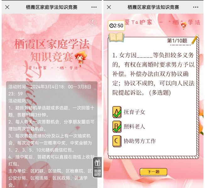 为深入贯彻落实习近平法治思想和习近平总书记关于妇女儿童和妇联工作的重要论述,进一步宣传《中华人民共和国妇女权益保障法》等法律法规,在“三八”国际妇女节来临之际,栖霞区法学会、区妇联、区民政局、区政法各单位共同开展以“爱Ta护家——‘栖’学法”家庭学法知识竞赛活动,活动从3月4日至3月8日,以微信公众号线上答题的方式进行,引导辖区妇女尊法学法守法用法,鼓励妇女自尊、自信、自立、自强,提升妇女依法维护自身合法权益的能力,将法治精神传递到万千家庭。