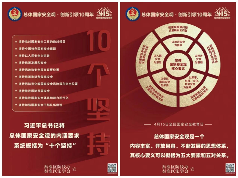 今年4月15日是我国第九个全民国家安全教育日,紧紧围绕“总体国家安全观·创新引领10周年”活动主题,秦淮区法学会、防线办认真组织开展以“八进”为抓手的“4.15全民国家安全教育日”宣传活动。以创新的方式方法和平台载体,拓展宣传途径,着力增强宣传活动的针对性、生动性、思想性,务求取得实实在在的效果。
