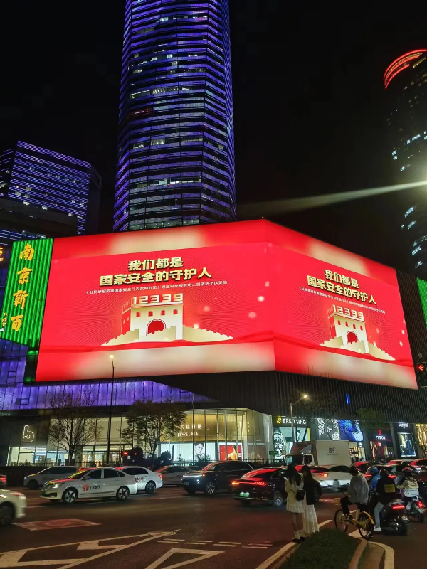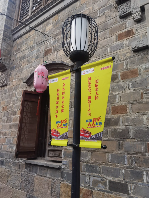 4、进商圈。利用商圈人口密集的地理优势,向游人发放《国家安全法》、《反间谍法》、《江苏省反间谍安全防范工作条例》等宣传资料,在新街口、夫子庙和老门东等“窗口”地区,借助户外大型广告屏和电子显示屏,滚动播放国家安全宣传标语和宣传图片。在老门东步行街利用灯杆道旗广告牌制作国家安全宣传内容,在商圈的电影院售票厅、游客中心电子屏插播“国家安全公益宣传片”、“12339公益宣传视频”、“安仔说国家安全”等微电影,进一步扩大“4.15全民国家安全教育日”的影响力。