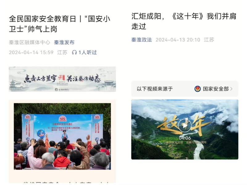 6、进微圈。利用手机自媒体传播快、效果好、推送准的特点,在“秦淮发布”“秦淮政法”和各街道、部门的微信公众号,积极宣传《国家安全法》、《反间谍法》等法律法规知识,在微博上滚动播放“国家安全公益宣传片”等微电影。同时,在线直播各街道、社区组织开展的宣传活动情况,适时向各街道、社区的工作群转发,推送宣传视频、图片和文字信息,让公众了解国家安全常识,汇集维护国家安全的强大合力。