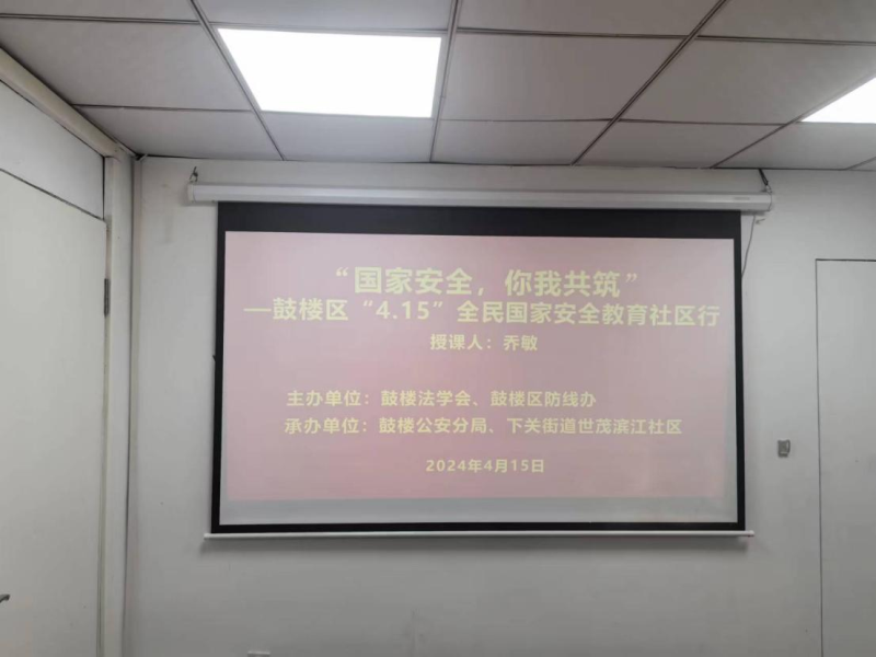 2024年4月15日是第九个全民国家安全教育日,为进一步筑牢总体国家安全观,增强居民群众国家安全意识,4月15日上午,鼓楼区全民国家安全教育活动走进世茂滨江社区。活动邀请鼓楼公安分局乔敏警官为社区居民群众作《反间谍法》专题宣讲,社区50余名居民聆听了讲座。