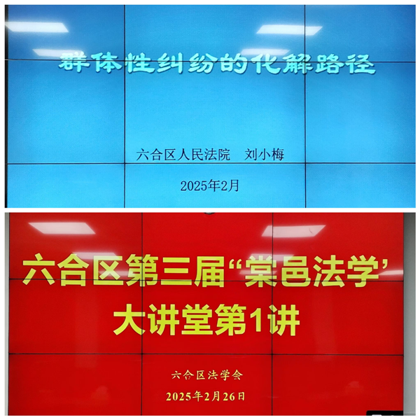 2月26日下午,六合区举办第三届“棠邑法学”大讲堂第1讲,由六合区人民法院立案庭副庭长、二级法官刘小梅讲授《群体性矛盾纠纷的化解路径》,六合区法学会专职副会长卯祥云主持。
