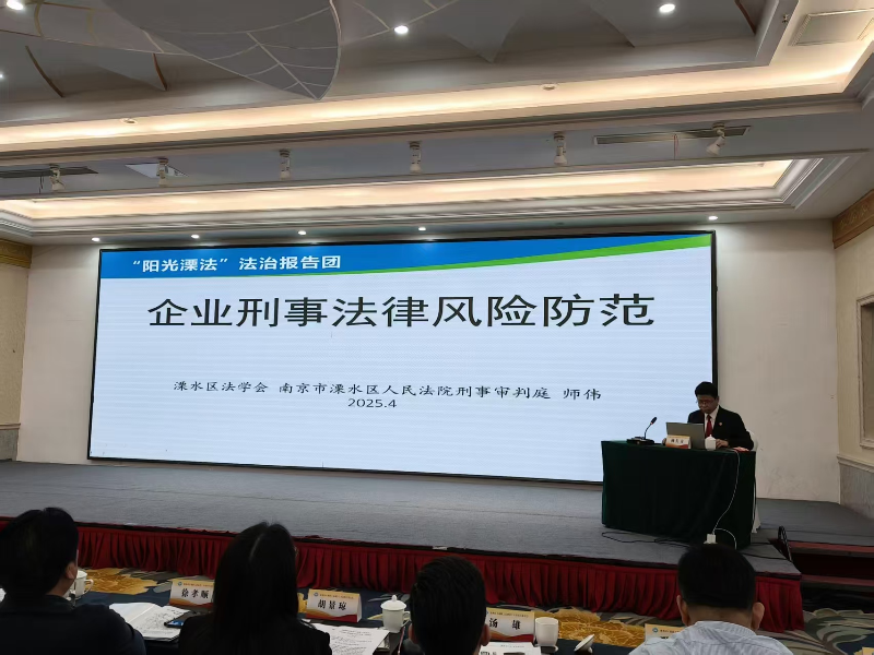 为大力弘扬法治精神,营造良好的法治氛围,4月8日下午,受区工商联(总商会)邀请,溧水区法学会组织会员师伟(溧水法院刑庭负责人)为区工商联(总商会)执行委员、相关企业负责人等开展“企业刑事法律风险防范”授课。通过剖析常见涉企刑事犯罪的典型案例,将法律条文与企业日常经营中的实际问题相结合,以案说法释明涉企刑事犯罪发生的原因,并据此提出有效对策,帮助企业增强法律意识,提升企业风险防范能力,为企业健康发展提供法治保障。同时,授课结束后,溧水区法学会现场发放区政法机关法治化营商环境调查问卷,深入了解溧水区法治化营商环境现状,掌握当前法治化营商环境取得的成效和存在的问题。