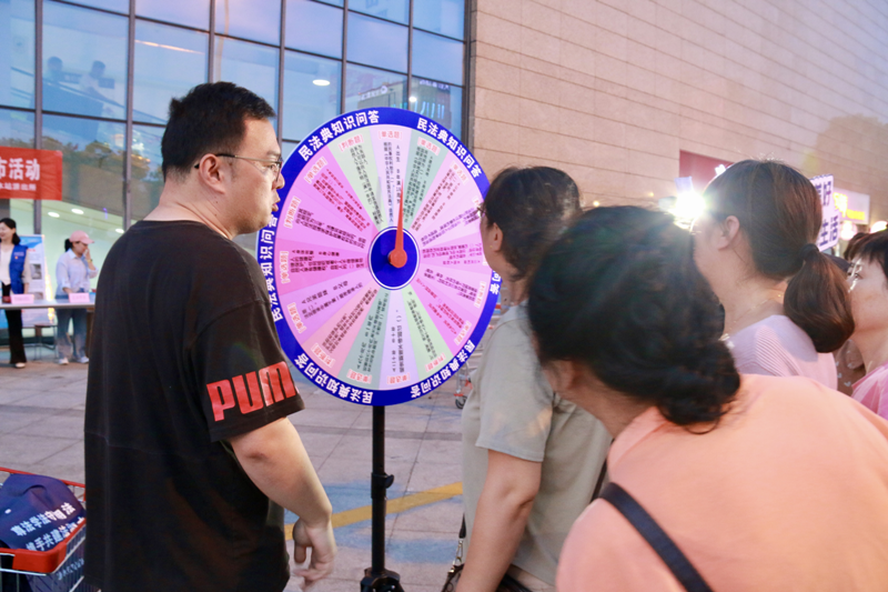 二是趣味互动游戏:让法律知识“动”起来。法治套圈圈与民法典知识问答的结合成为当晚亮点。参与者需先回答“限制民事行为能力人的年龄界定”“高空抛物责任归属” 等法律问题,答对即可获得5个套圈机会,套中印有“民法典守护美好生活”“遇事找法不吃亏”等标语的法治盲盒,奖品包含法治垃圾袋、法治围裙等实用物品。“这种形式太有意思了!孩子在玩游戏的过程中记住了‘未成年人打伤人由监护人担责’的知识点。”家长李先生带着孩子连续参与两轮,收获满满。