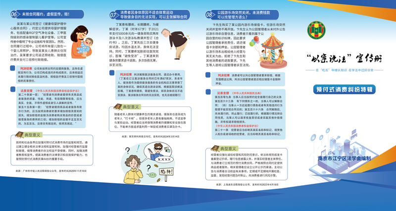 江宁区法学会坚持问题导向,聚焦同人民群众日常生活相关的预付式消费领域问题,结合《解释》内容编制了《以案释法宣传册——预付式消费纠纷特辑》,收录“赠课不纳入退费?赔!”等8个日常生活易“踩坑”的典型案例,以期通过叙述简明、图文并茂的方式让群众在“吃瓜”中收获法律知识,维护自身合法权益。