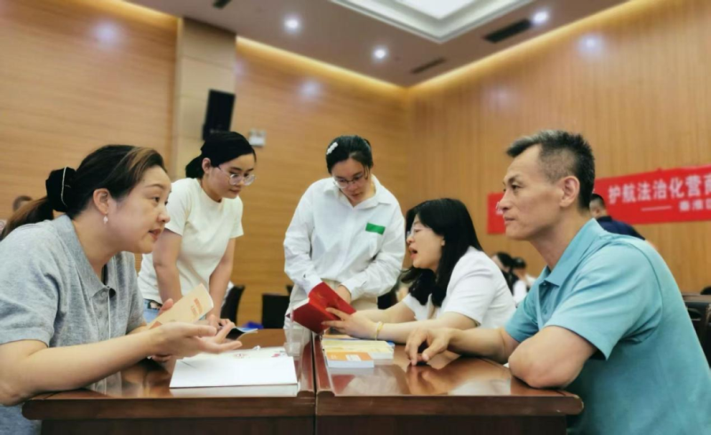 本次活动,依法治区办统筹区法院、区检察院、区法学会、秦淮公安分局、区发改委、区司法局、区人社局、区市场监管局、区商务局、区总工会等单位业务骨干,现场进驻园区采取“点对点、面对面”的“市集”模式,自由、灵活地与各企业开展互动交流,既有法学法律“专家坐诊”,法官、检察官、律师及执法部门工作人员“答疑解惑”,也有法治宣传“大礼包”—发放《民法典》《法律援助法》《工伤保险条例》等宣传资料及实物,方便员工查阅学习。
