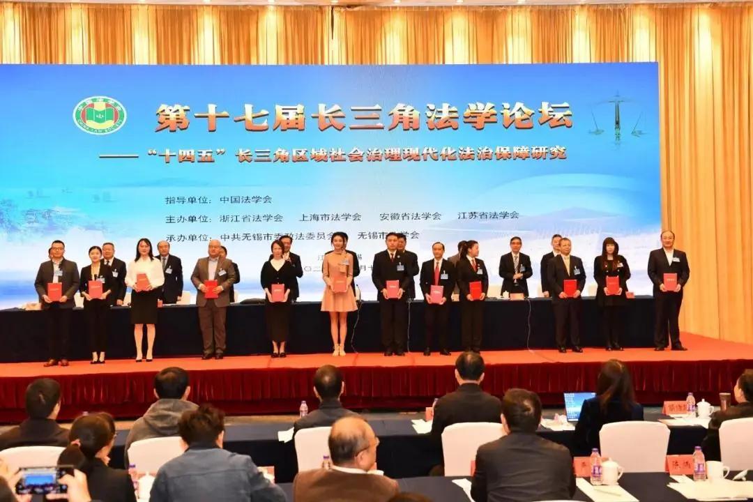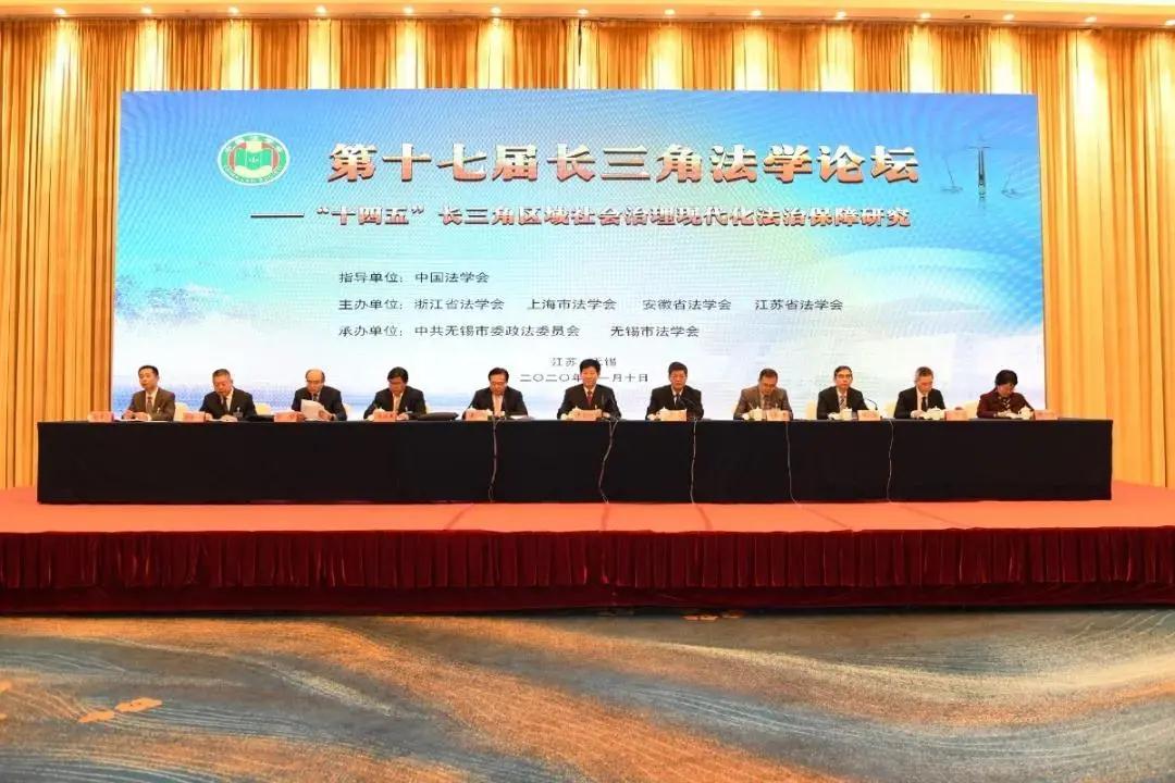 11月10日,第十七届长三角法学论坛在无锡市召开。本届论坛主题是“十四五”长三角区域社会治理现代化法治保障研究。中国法学会党组成员、副会长王其江,江苏省政协副主席、省法学会会长周继业,无锡市委书记黄钦出席会议并致辞,中国法学会一级巡视员诸葛平平、二级巡视员李仕春出席开幕式,省委政法委副书记顾俊主持论坛开幕式。